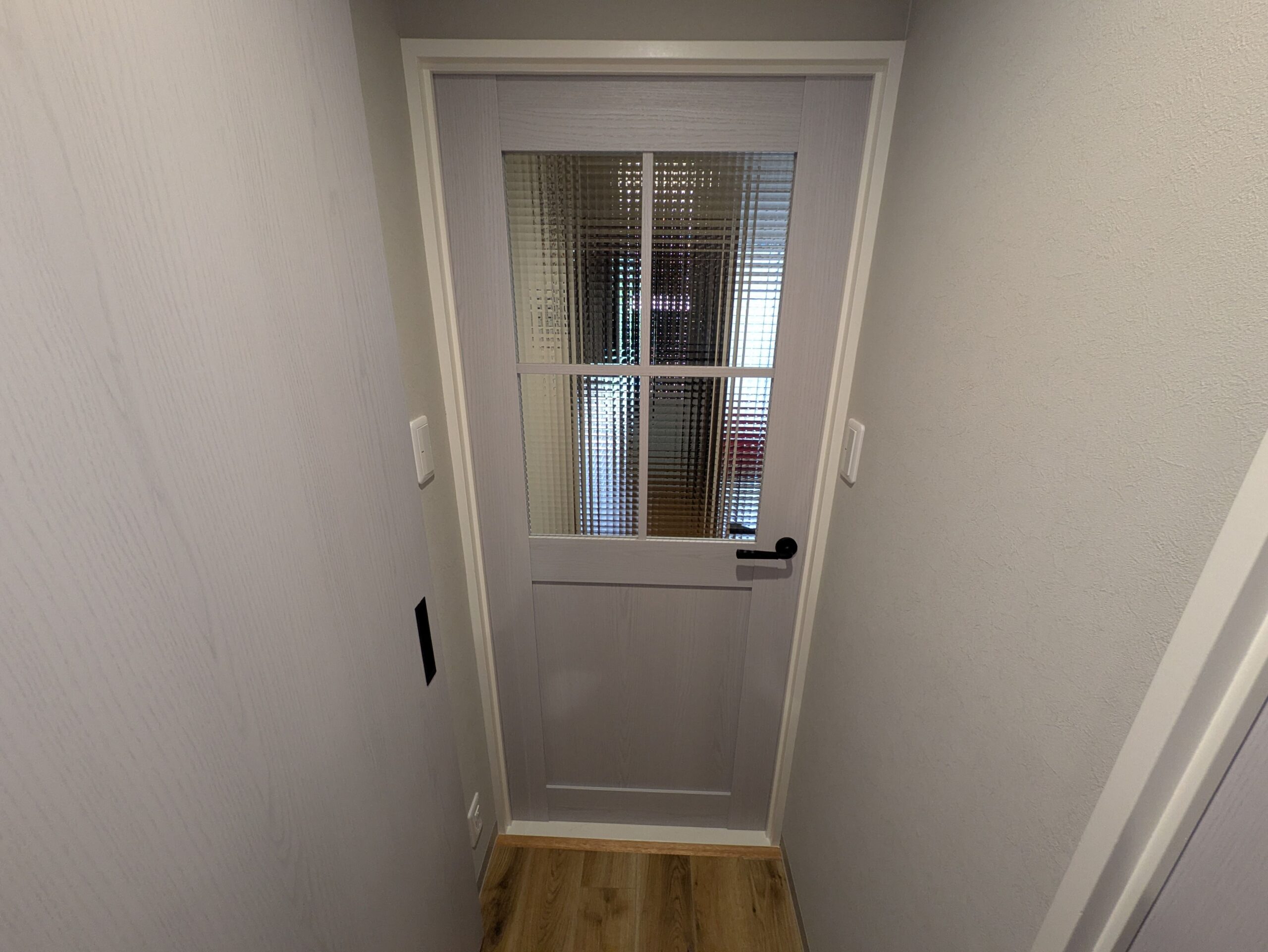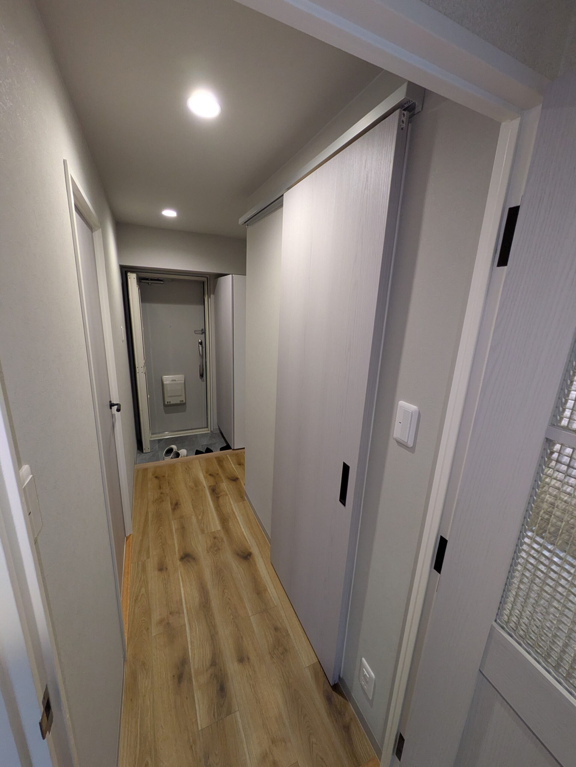 【廊下及び建具改修工事】廊下の暗い雰囲気を変えたい!との要望受け、廊下のクロス及び塗装工事、その他建具の交換、また照明の交換を行い暗かった廊下回りが明るくなり、またレトロな雰囲気の建具も設置しこれまでの雰囲気から一転、明るくレトロモダンな雰囲気に!帰宅するのが楽しみ!とお喜びいただきました。